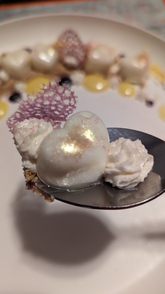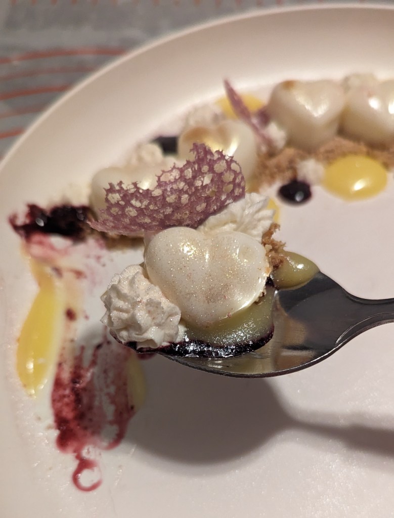 My version is a brilliant example of being adventurous with textures and flavors, with a silky panna cotta, a zesty lemon curd, and a sweet-tart blueberry coulis all coming together in perfect harmony. Topped with a fluffy cloud of Chantilly cream and a delicate tuile garnish.
